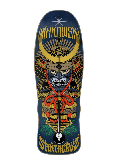 Santa Cruz Skateboards Erick Winkowski Samurai Pro shaped deck featuring spot gloss and metallic graphics by Makoto Yamaki @makoyamaki on Erick’s newest custom shape with blue stained veneers and front wheel wells.