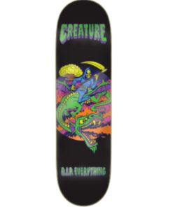Presented by Creature Skateboards in an 8.5″ width and a seven-ply Birch construction, the Rip Everything skateboard deck arrives with printed graphics on the bottom ply. Showing an illustration of a grim reaper riding a dragon, the board’s graphic pictures a creative doomsday scenario
