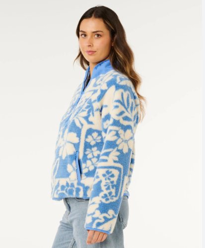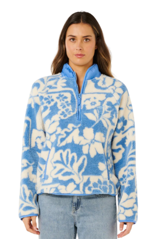 The Ripcurl Party Pack Polar Fleece in blue combines comfort and coastal style, crafted from 100% polyester for a thick, fluffy feel ideal for cooler days. Featuring an all-over light blue and cream floral pattern, this pullover is perfect for layering during outdoor adventures or casual surf trips. Its quarter-zip front and stand-up collar provide versatile coverage, while the relaxed fit and long sleeves ensure ease of movement. With two front pockets trimmed subtly, it offers practical storage and a cosy place to warm your hands. Stay comfortable and stylish on and off the water with this nature-inspired fleece piece designed for the surf and outdoor lifestyle enthusiast.